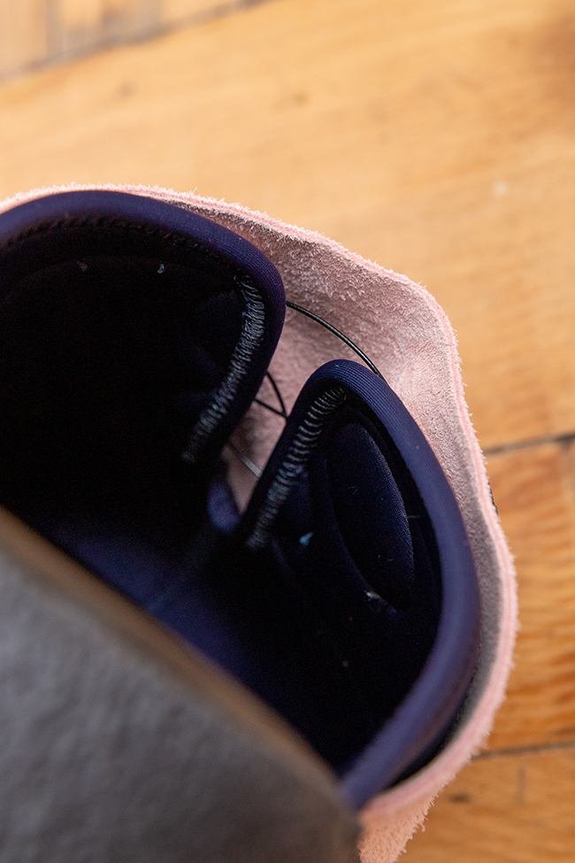 履きこむことで味のでるスウェードを外側に、伸縮性のあるネオプレーンを内側に配置した適材適所の素材選択。