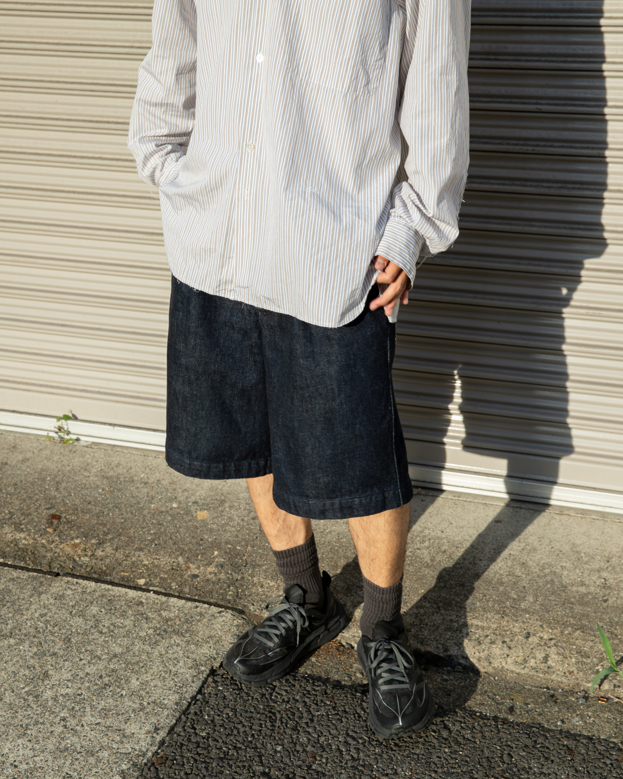 デニムという部分とショーツという部分。それぞれ分けても一致するのがどちらも「カジュアル」という見え方です。加工を強くすることや股上を深く全体のレングスを長くすることで、ショーツの存在感を強くし、トップスがシンプルでも合わせやすくするパターンのショーツはよく見られます。僕がこのアイテムを良いと思ったのは、その見える部分と見えない部分のバランスが良く、カジュアルに見えすぎない点です。先程のディテールの話でお伝えさせていただいた際に、部分部分でクラシックな印象を感じられたと思います。スーツやジャケット、スラックス。これらのクラシック要素を取り入れたのなら、アウトタックではなくインタックを取り入れるのが、一般的と言いますか僕ならしてしまうなと思いました。ですがO-はその部分はアウトタックで作る。足し方と引き方が絶妙です。