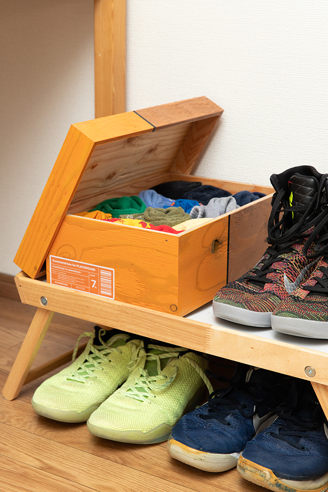 靴箱をデザインソースにしているので、もちろん靴も入ります。(サイズ大きすぎると入らないかもしれません)