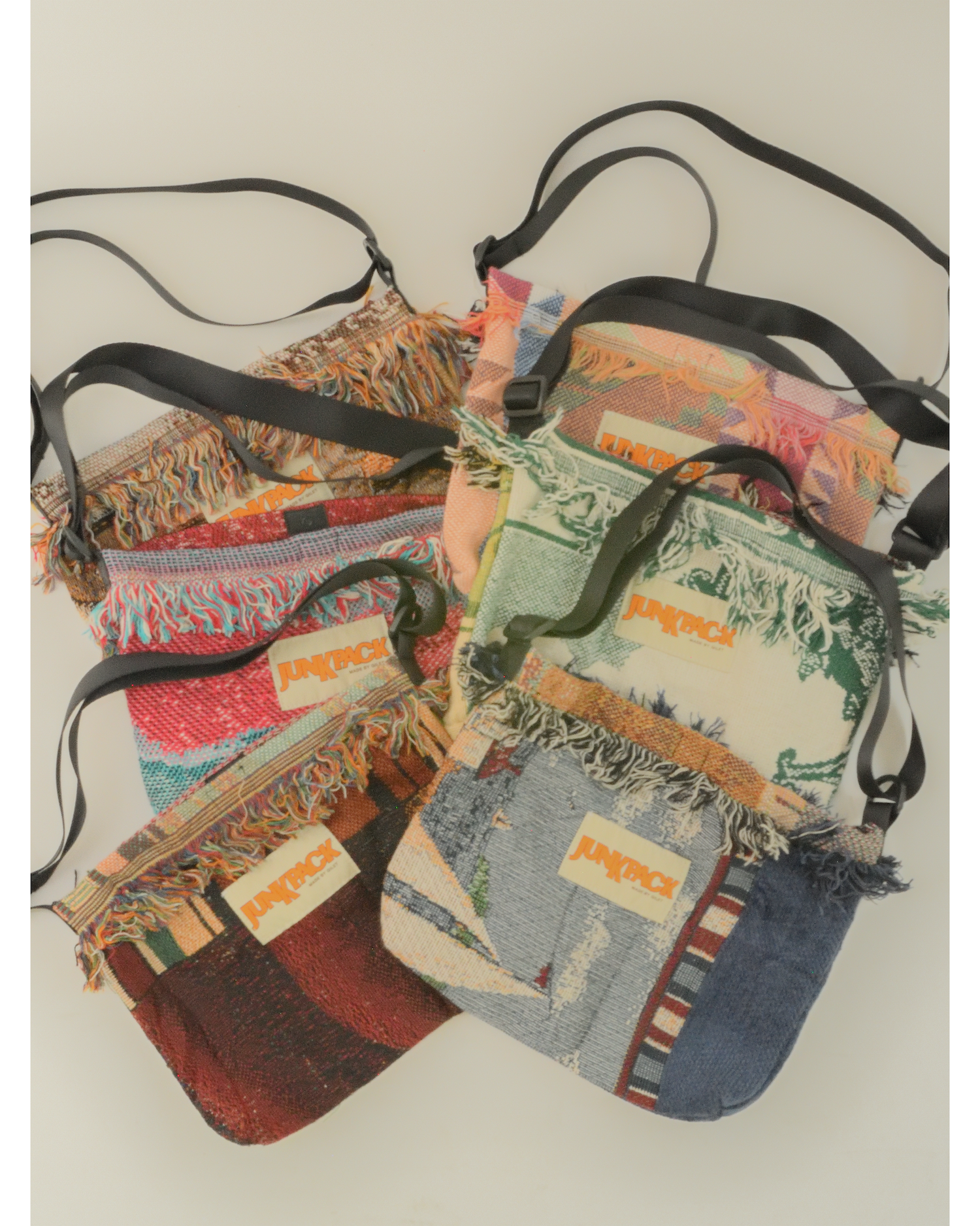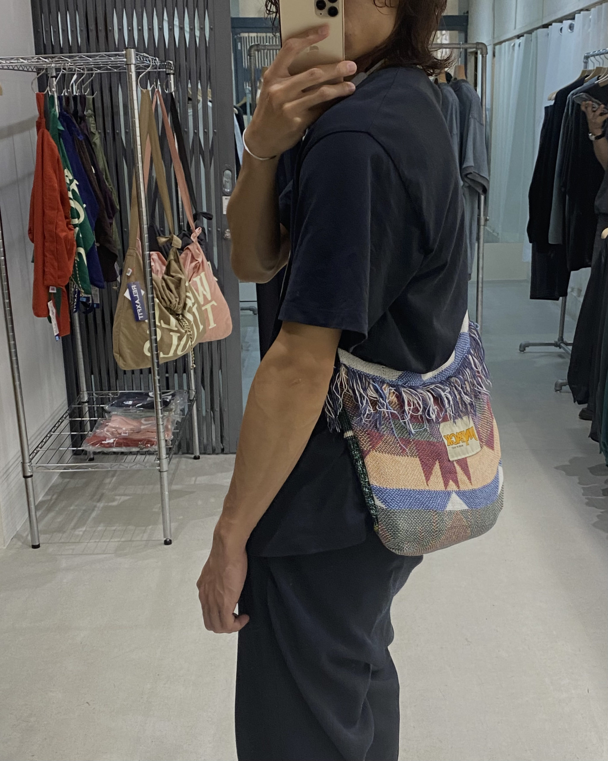 続いては横長のサコッシュ。この形は僕が持っているバッグが元ネタになっています。気に入って使ってはいるのですが、メッシュ地なので中身が見える事と夏時期はいいのですが秋冬としては使いづらい点が僕の中では悩みでした。そんな悩みもタペストリーだったら中身も見えないですし、通年使えるのではないかと思い作っていただきました。また、横長の形の優しさとタペストリーの渋い柄、生地感がうまくかけ合わさり他にはないファッションアイテムになったと思います。