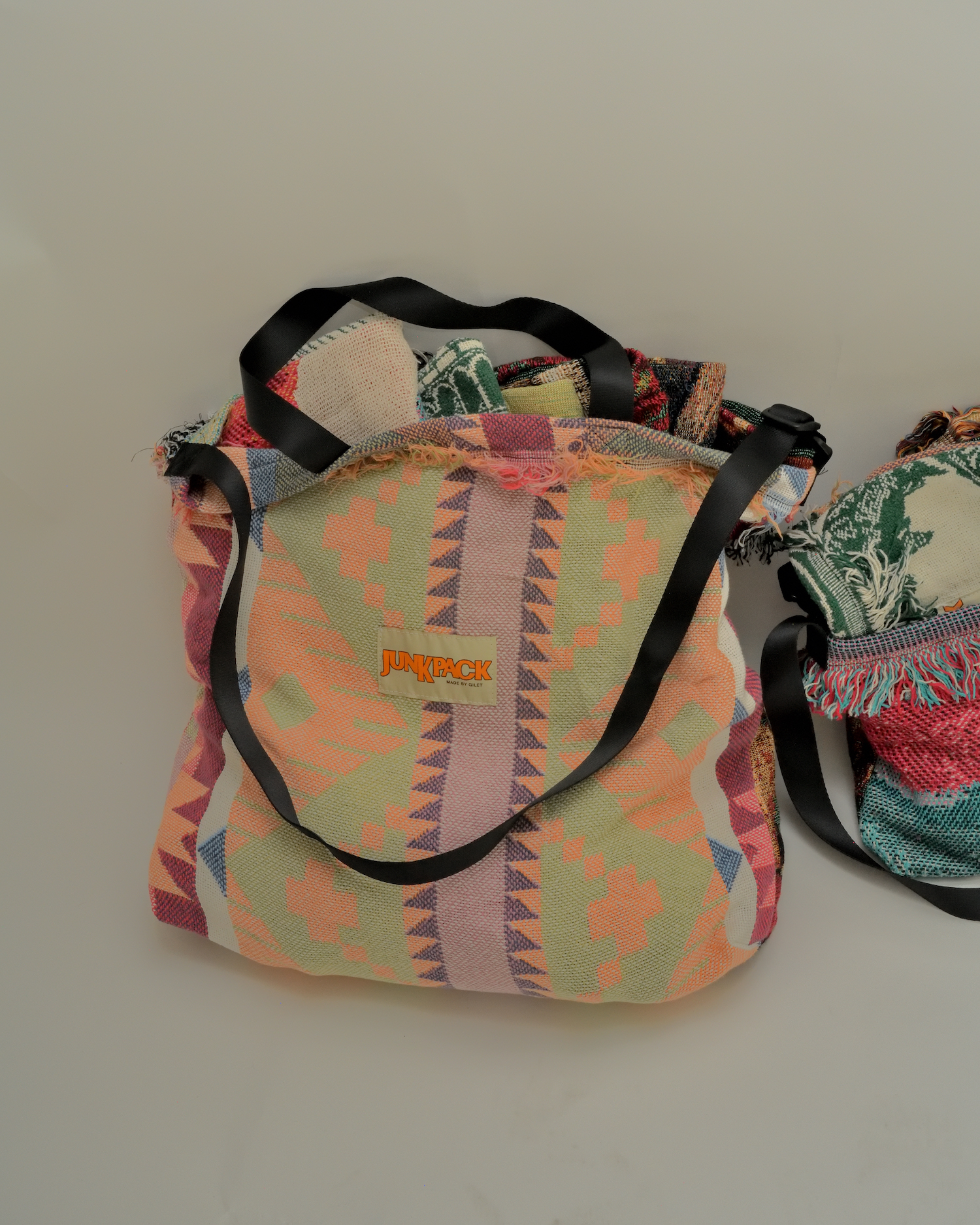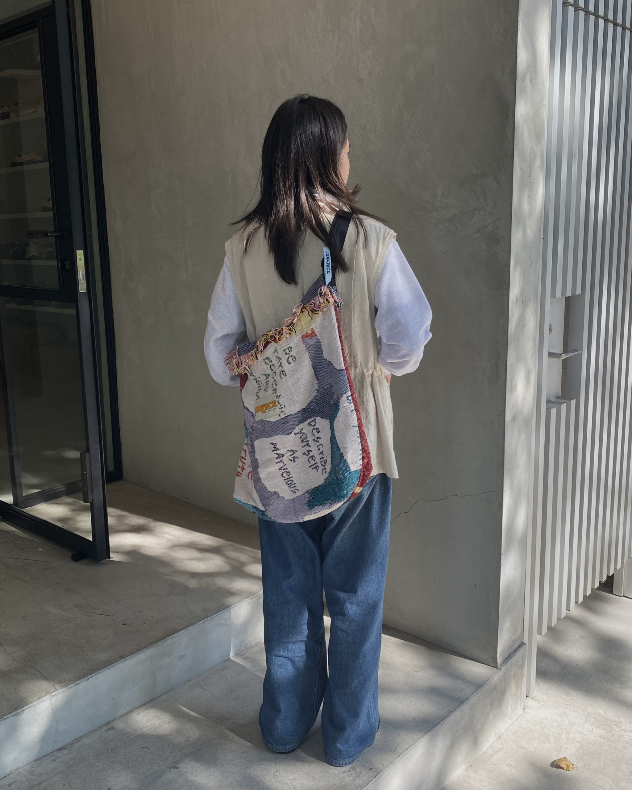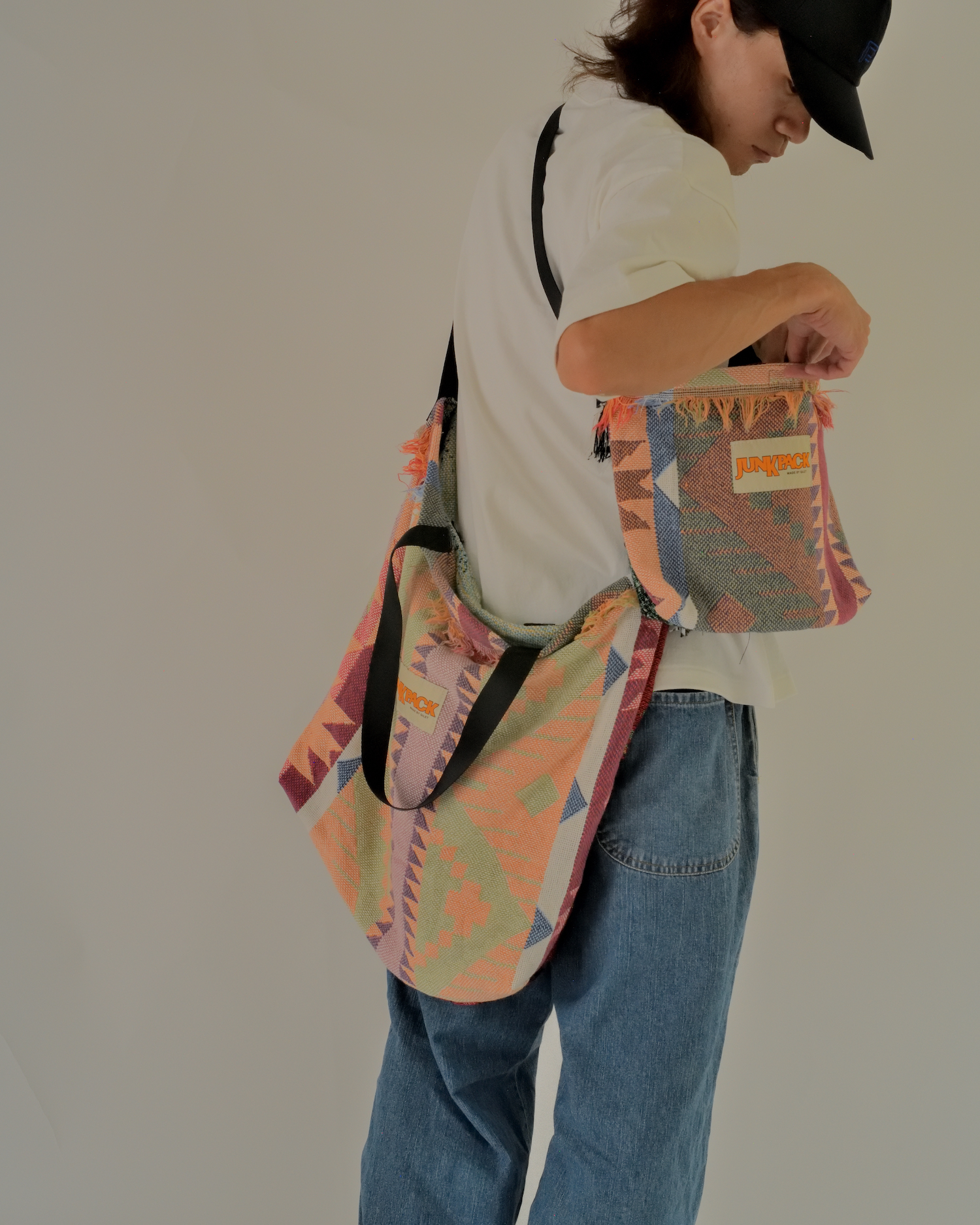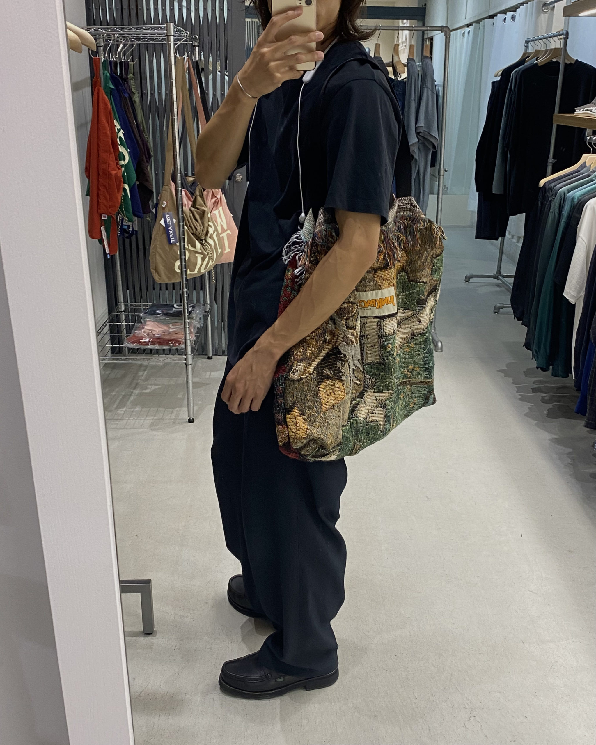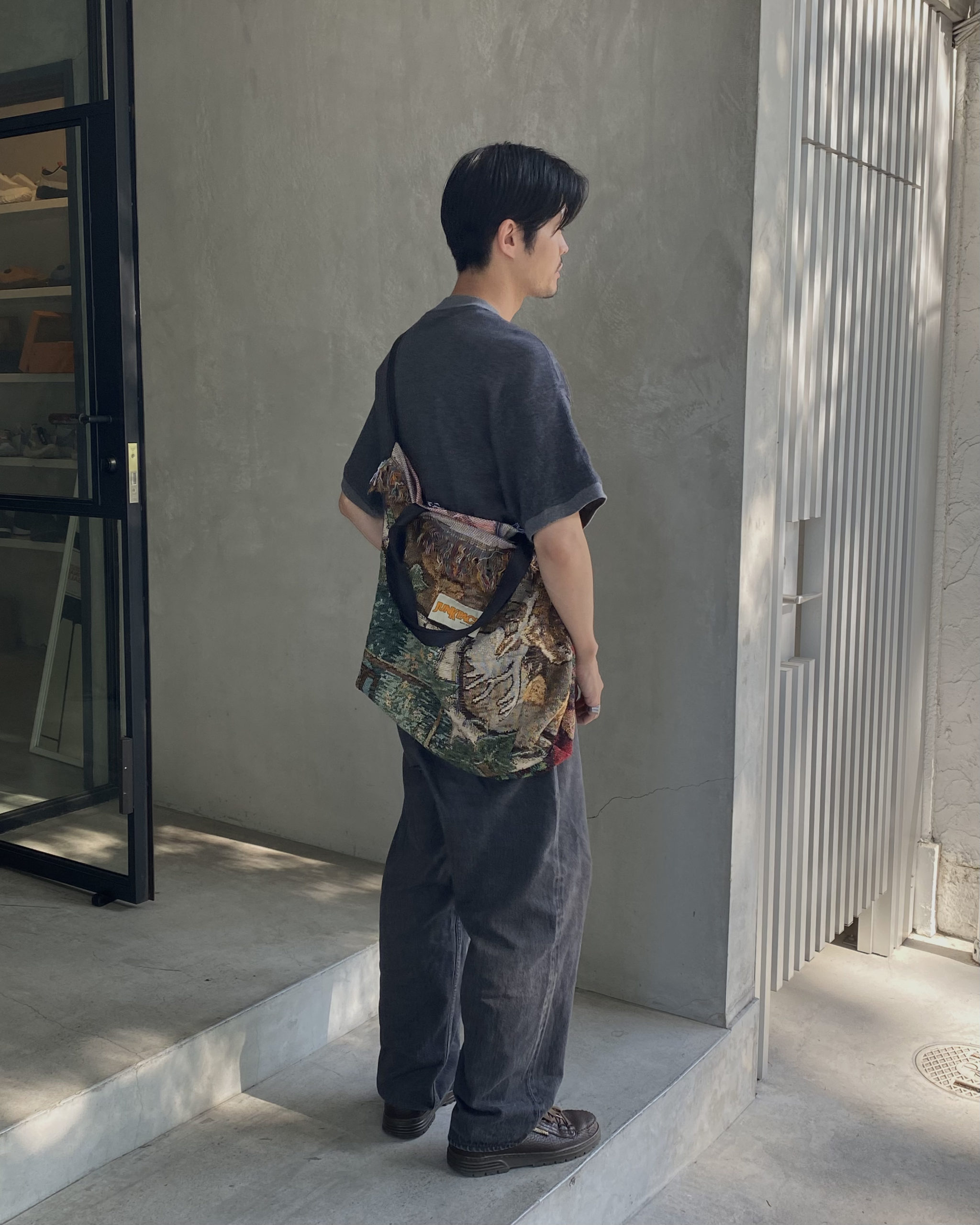 先ずはトートバッグとしてもショルダーバッグとしても使用できる2WAYバッグ。これは昨シーズンも作っていただいた形で大変好評でした。ですが、一つだけ難点があり、、、。前回はショルダー部分の肩紐が調整不可でした。デザインは好きだけど長すぎたり短すぎたりで諦める方がいられました。そんな悩みや悔しさを解消すべく、150cm代~180cm代まで皆さんお好きな長さに調整できる肩紐に進化させました。また、それに伴い化繊となりましたので、夏時期の汗染みや秋冬のスタイリングの幅としても広がったと思います。レトロな風合いのタペストリー生地と実用性と耐久性に富んだ化繊を組み合わせることで現代的なファッションアイテムになったと思います。