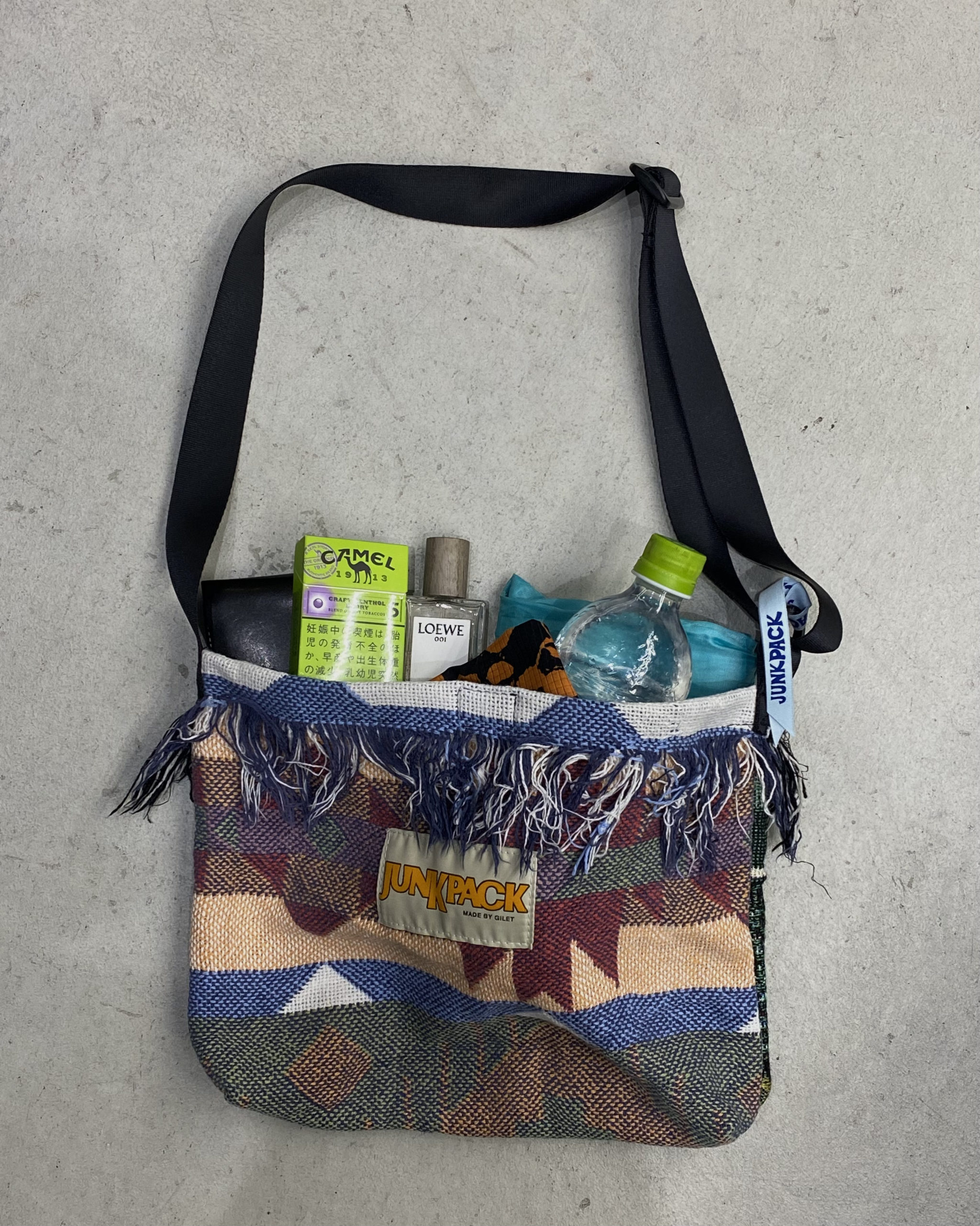 続いては横長のサコッシュ。この形は僕が持っているバッグが元ネタになっています。気に入って使ってはいるのですが、メッシュ地なので中身が見える事と夏時期はいいのですが秋冬としては使いづらい点が僕の中では悩みでした。そんな悩みもタペストリーだったら中身も見えないですし、通年使えるのではないかと思い作っていただきました。また、横長の形の優しさとタペストリーの渋い柄、生地感がうまくかけ合わさり他にはないファッションアイテムになったと思います。