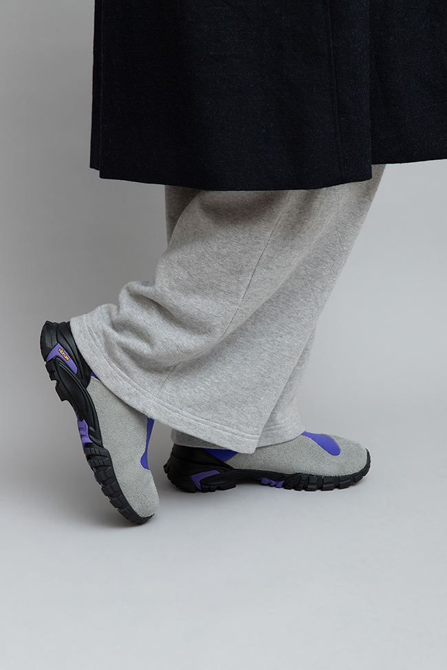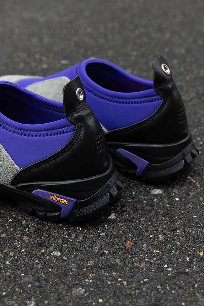 履き口にパープル、アッパー前面はグレー、ヒールはブラック。