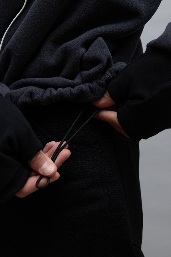 つなぎの特徴かなとも思える、ウエストの絞りは裾にあるドローコードで解消。
