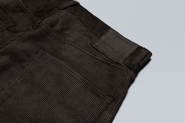 ブラックを等間隔で色抜きした生地を使用し、コーデュロイの畝と綾状の模様が混じった独特な雰囲気に。