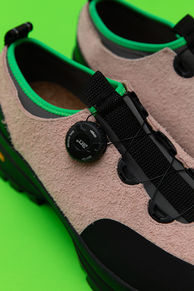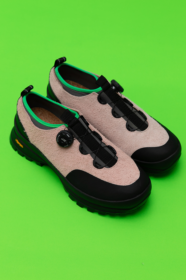 ビビッとではない淡いイメージのピンクに、履き口のパイピングが黄緑、ライナーソックはグレーです。